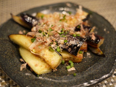 これもとてもシンプルな料理です。多めの油を使い、焼くというよりは揚げ焼きにするといった感じで調理します。網で焼くさっぱりとした焼きなすも美味しいですが、油を使って焼いたなすも美味しいんですよね。仕上げの醤油は鍋肌からまわし入れ、ちょっとだけ焦がします。